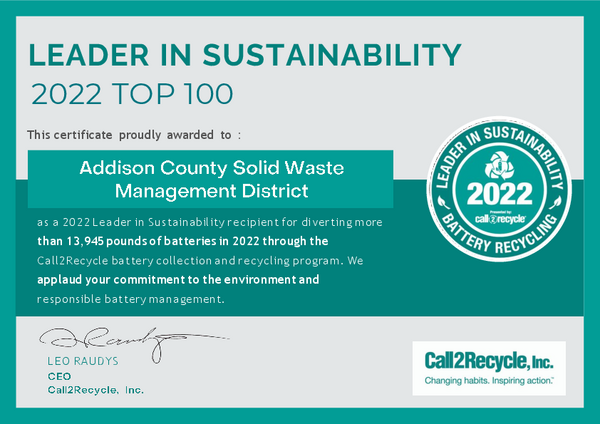 The Addison County Solid Waste Management District received Call2Recycle's 2022 Top 100 Leader in Sustainability award. The annual Leader in Sustainability award is given to top performing organizations and businesses who demonstrate a notable commitment to battery collection and recycling. The District participates in Call2Recycle's consumer battery program and helped Call2Recycle recycle nearly 8 million pounds of consumer batteries in 2022.